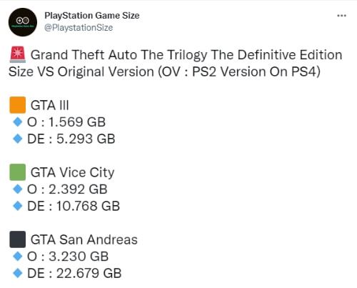 近日,推特用戶PlayStation Game Size曝光了PS5版《GTA:三部曲 最終版》的游戲容量,并與PS4上運行的PS2原版游戲進行對比。此外,據他透露,游戲將于11月9日開啟預載。